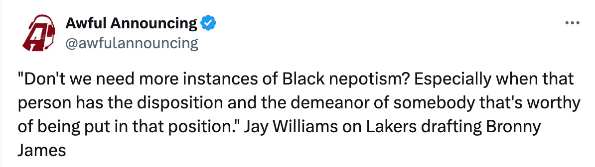 As someone who is on the record as pro-nepotism and pro-Bronny James, let me just clarify: This is a dumb. You should not literally make the case for nepotism, or favoritism more generally. But if you want to defend something like this, then what you should say is: